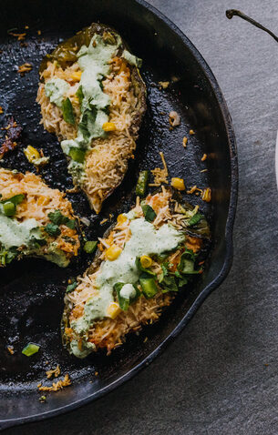 Ingredients: Poblanos | Chicken Breast | Black Beans | Corn | Summer Squash | Onion | Mexican Cheese Blend | Cilantro | Cumin | Coriander | Lime Crema