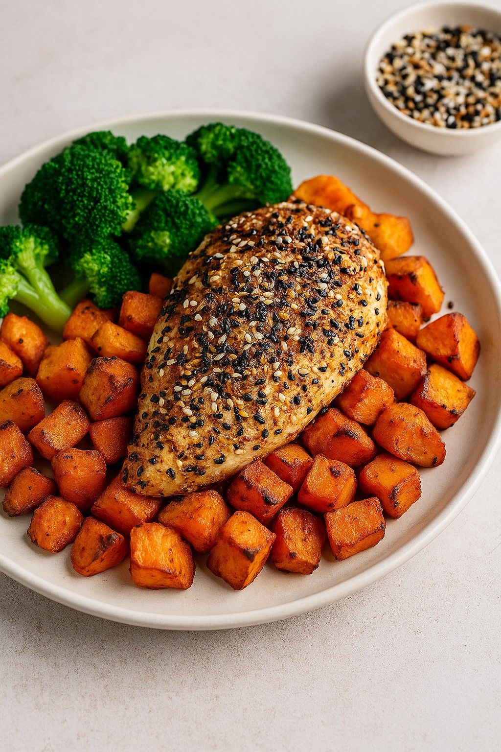 Everything Seasoned Chicken over Roasted Sweet Potatoes & Broccoli