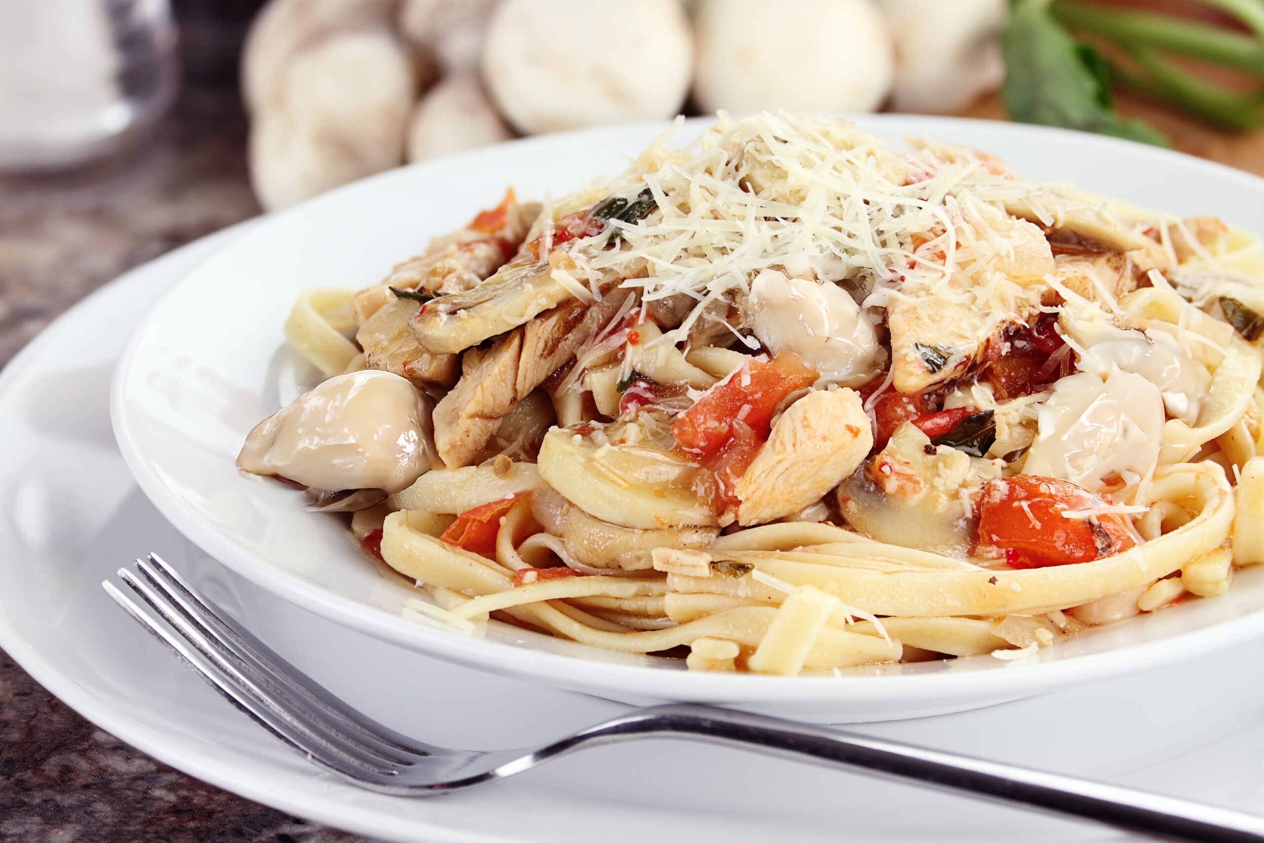 Grilled Chicken over Tuscan Kale, White Beans & Fettuccini Pasta with Roasted Tomatoes