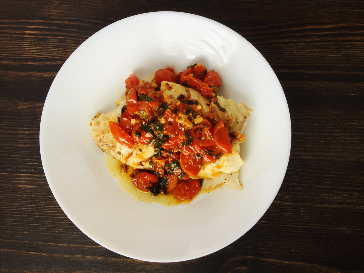 LC Parmesan Cornmeal Crusted Tilapia with Roasted Tomato Chutney over Zucchini Noodles with Sauteed Broccoli