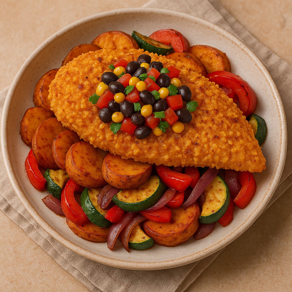 Tortilla Chip Crusted Chicken with Black Bean & Corn Salsa over Chile Rubbed Potatoes & Grilled Vegetables